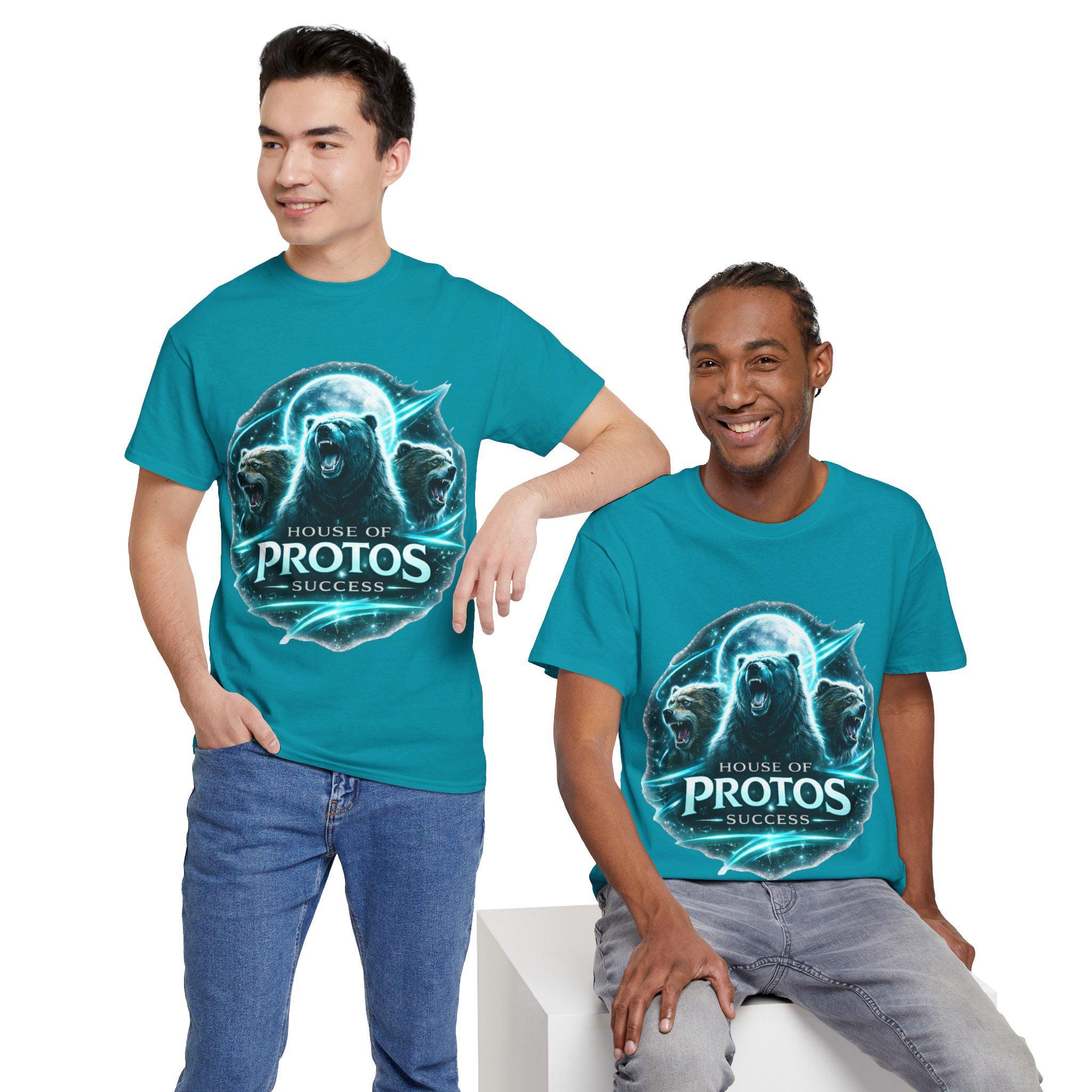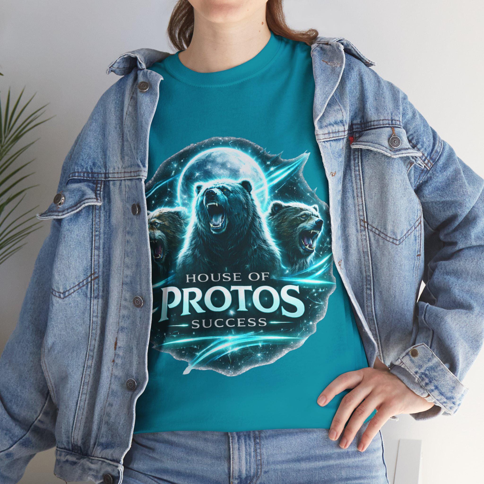 This bold tee brings together raw wilderness energy and gamer-house pride. A luminous, moonlit design features three roaring bears encircling the words “House of Protos – Success,” rendered with crisp, high-contrast printing that pops on the vibrant teal fabric. Wear it to show allegiance to team spirit or to add a fierce, statement layer to your everyday rotation. The classic crew cut and relaxed fit make it comfortable for long streams, late-night strategy sessions, or chilled weekends out. The breathable cotton and durable construction mean the artwork stays vivid wash after wash, so the emblem stays as loud as your ambition.