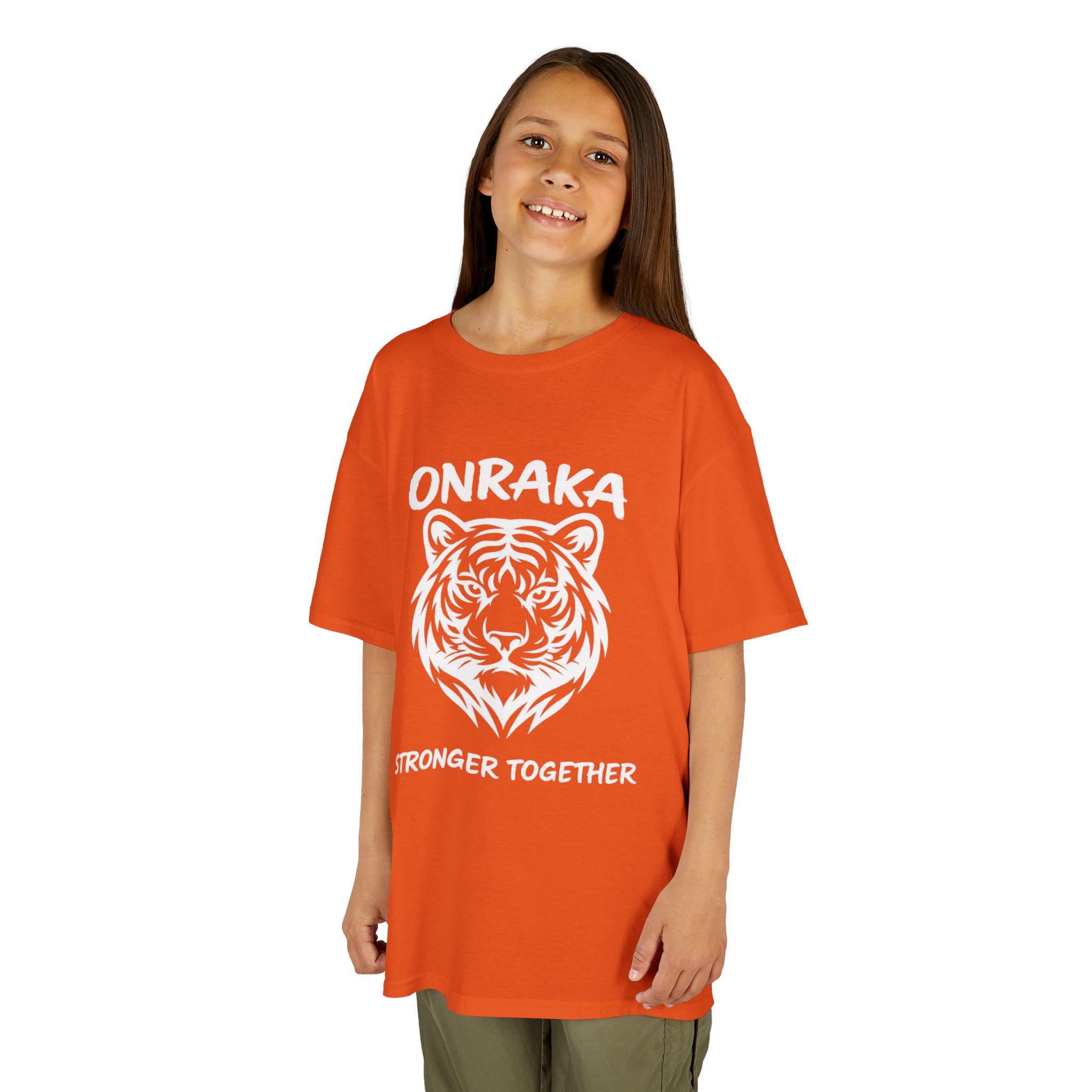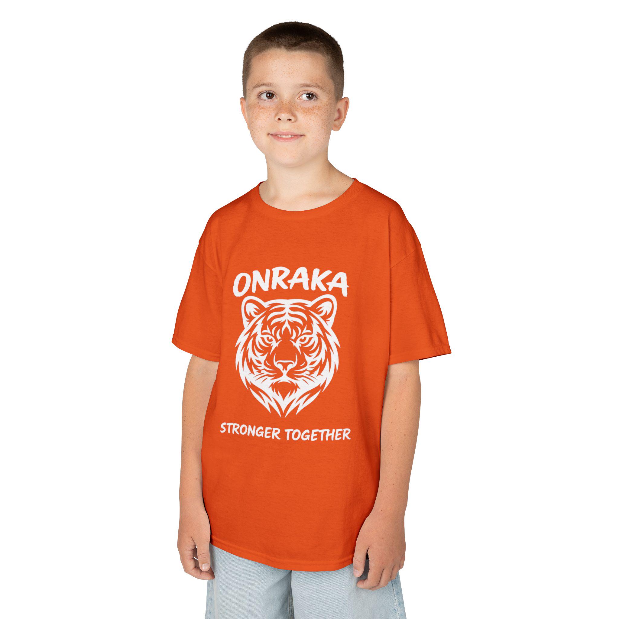 Show your House of Onraka pride with this Stronger Together youth tiger T-shirt designed for students who lead with resilience, determination, and teamwork. Featuring the bold Onraka tiger mascot and empowering message, this kids school spirit tee celebrates unity while supporting a positive classroom culture.