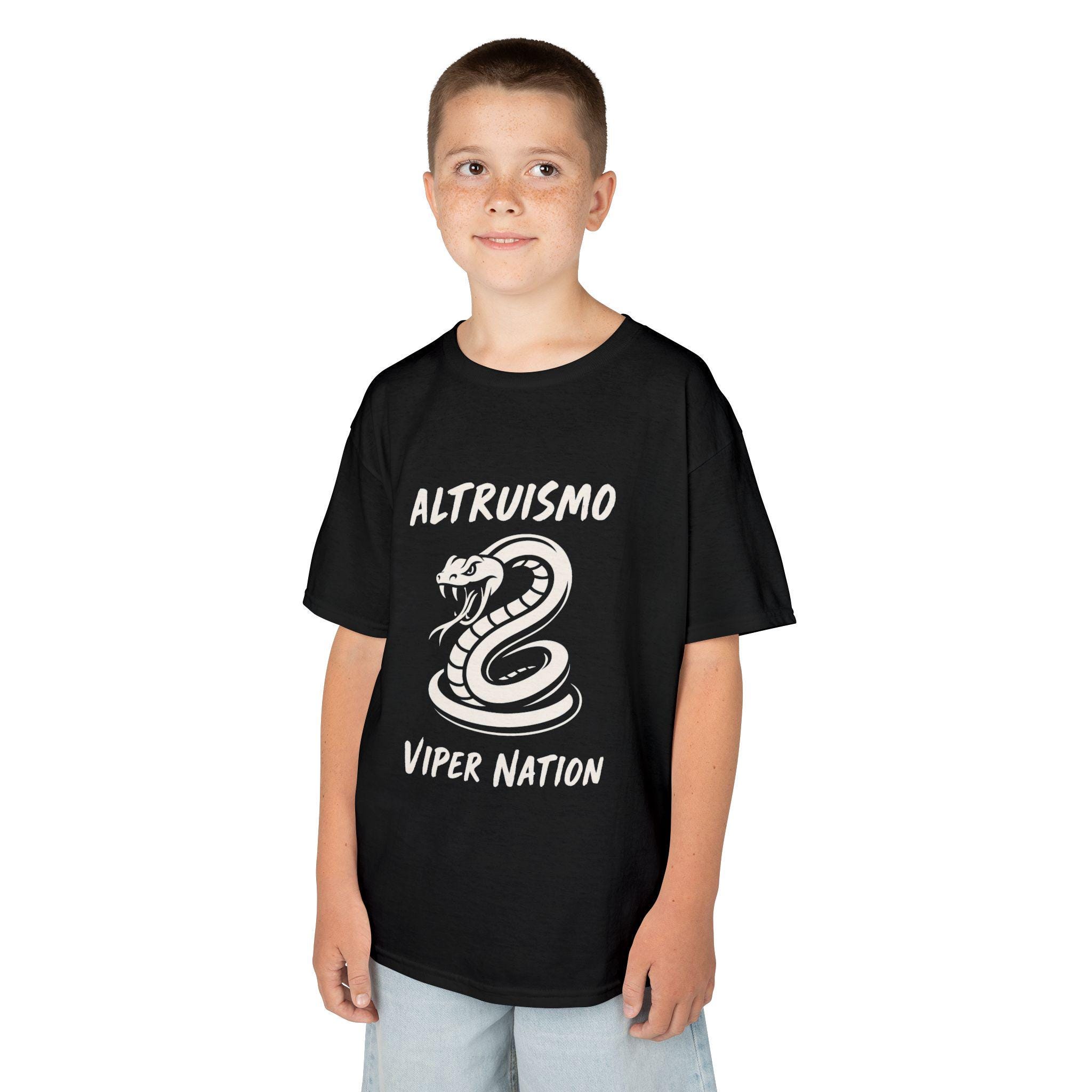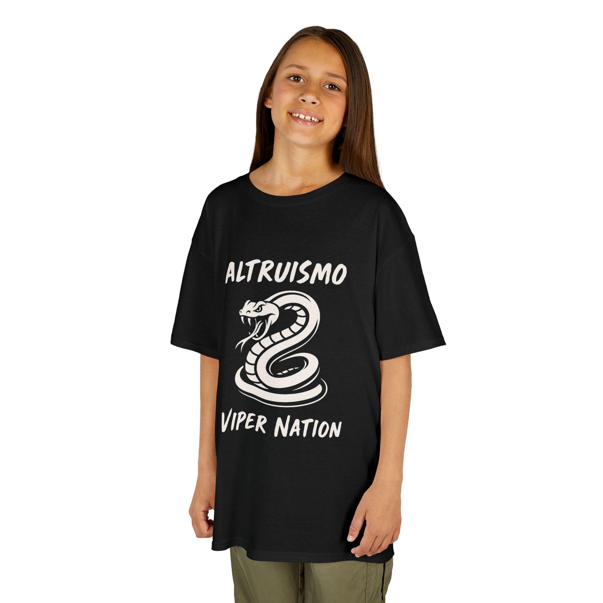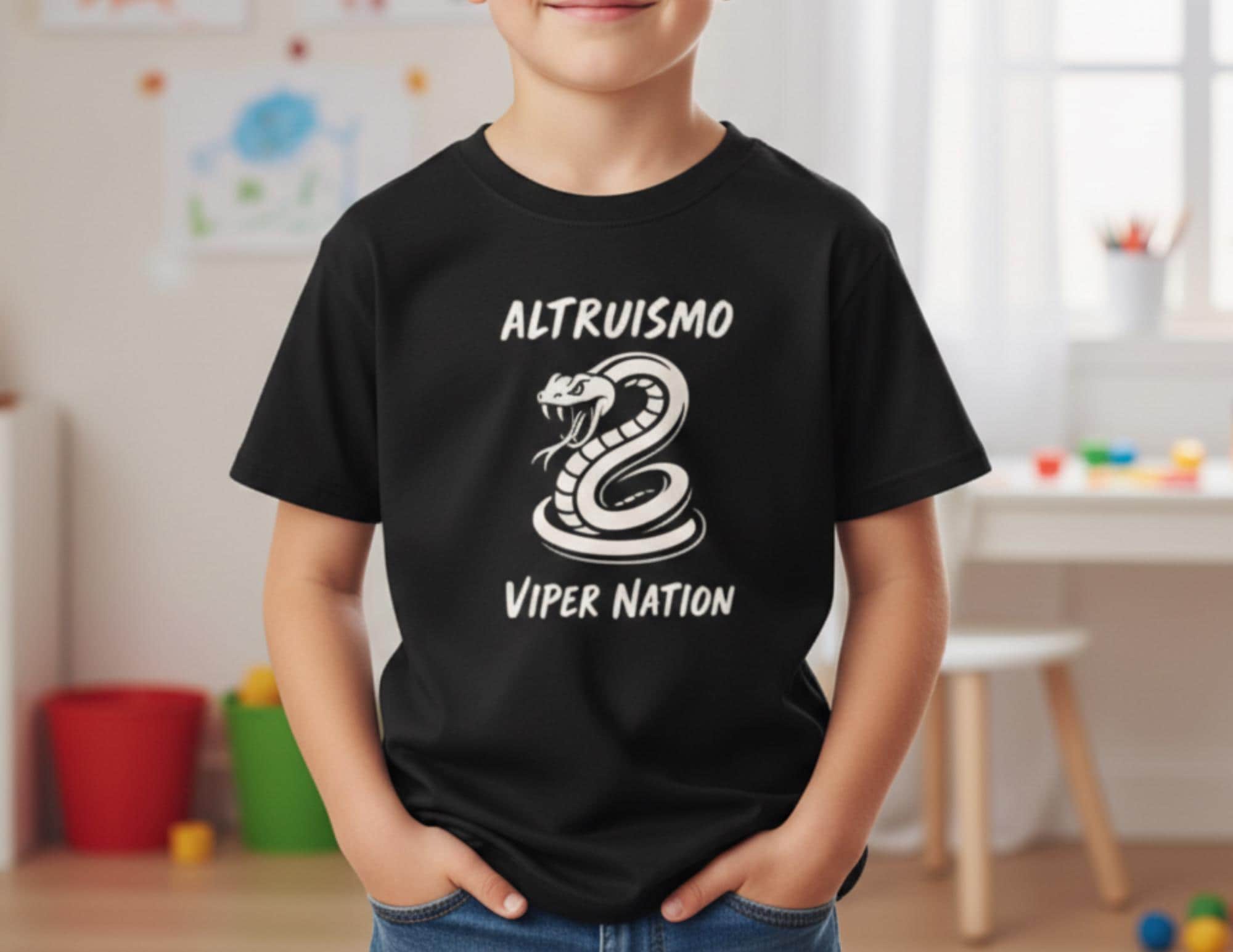 Celebrate generosity and school spirit with the Altruismo Viper Nation Kids T-Shirt, a perfect givers spirit tee designed for youth involved in house systems and positive classroom culture. This comfortable and breathable youth top features the Altruismo viper design, promoting values of service and kindness.